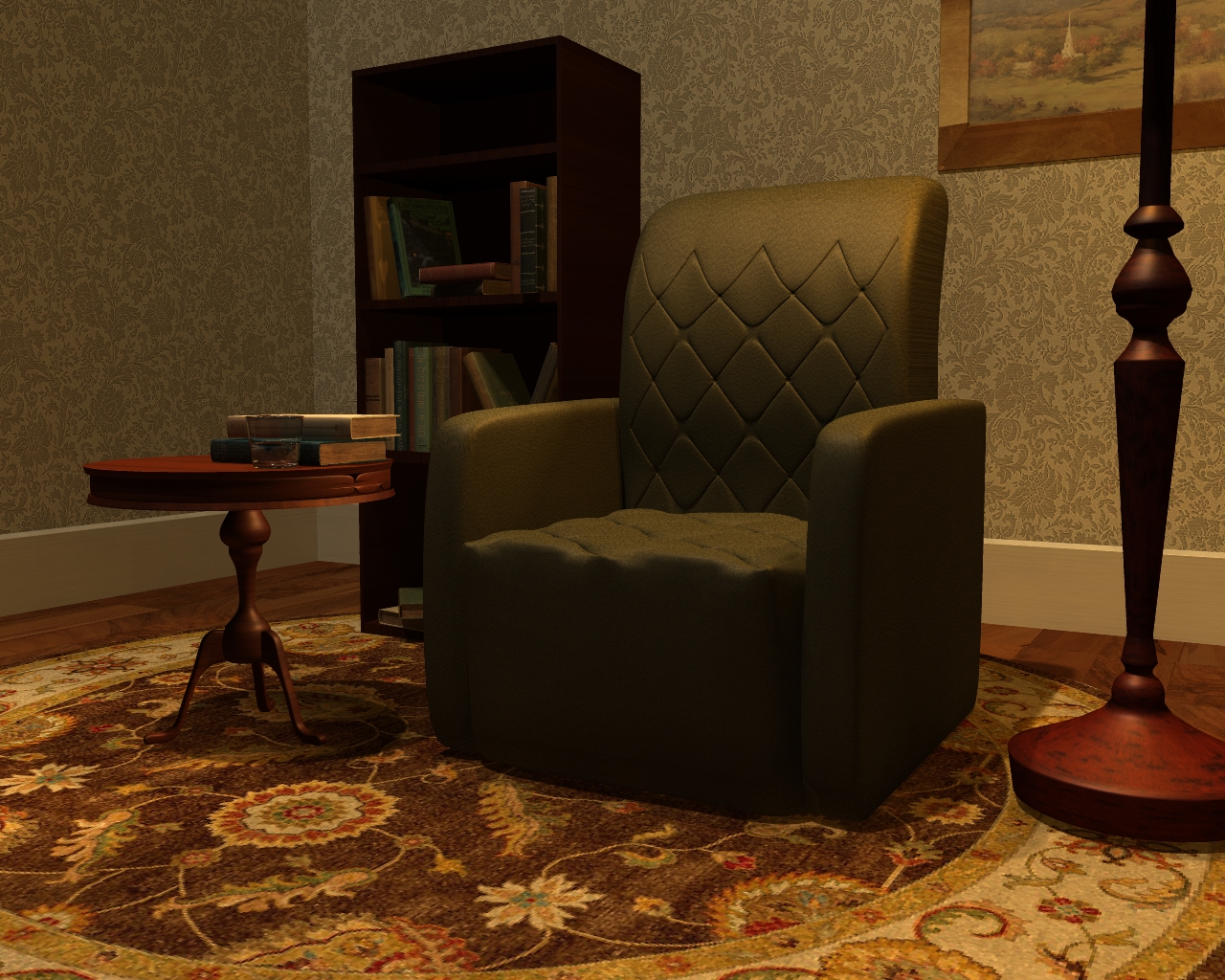 The scene I constructed is an old-fashioned reading room at night, with a warm, relatively dim light that creates a tranquil and relaxed atmosphere. I enabled both mental ray and raytracing in render settings in order to get full effect of the glass on the small table. Fur texture is applied for the carpet and light glow is also applied for the standing lamp to simulate a more realistic light source.